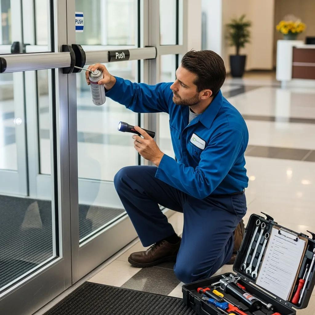 Technician inspecting a commercial door with tools in a workshop setting